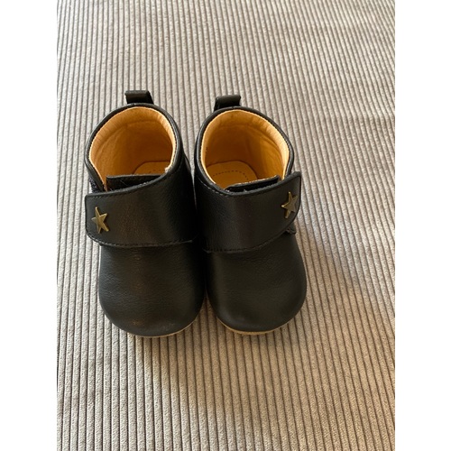 Niet op stevige zolen laten lopen, daar kunnen ze platvoetjes van krijgen. Pas als hij het lopen langere tijd goed onder controle heeft, kun je ze dikke zolen aan geven.. Schoentjes van Aapies of Elefanten zijn goeie schoenen 馃槉
