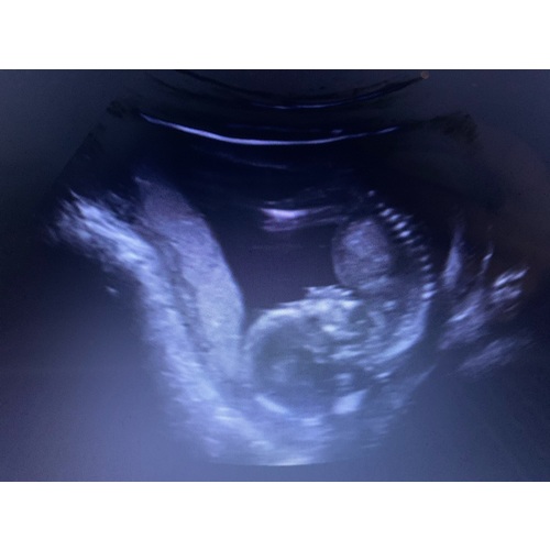 Zo lag onze kleine erbij. Met het hoofdje op mijn blaas. Ook wilde die niet draaien en bleef het constant op de buik liggen😂.. Ze noemde het een buikslaper, lijkt op mij dus haha🙈