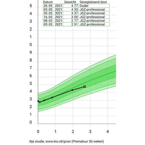 Is je kleintje alert? Heb je voldoende plasluiers? Dan is er aan de hand van deze curve nog niet zoveel aan de hand. Je kindje is misschien klein maar loopt eigenlijk heel mooi in de groeilijn. Ga niet op grammen hangen. Je kan bijvoorbeeld nu je kleintje een fles geven van 100ml. En hij heeft zijn kakluier van de dag nog niet gehad. En na 3 uur weer wegen, kakluier is geweest en de fles is inmiddels er ook af in een plasluier. Weeg je zo 150 gram minder. Even voor de beeldvorming. Vaak is beginnen met rommelen in voeding niet persee een goed idee. Het kost namelijk ook enorm veel energie om over te schakelen op een andere voeding. En daarnaast hanteert het CB TNOcurven. Google maar eens. Dat is een gemiddelde getrokken uit voornamelijk witte kinderen. Als je 10 te dikke kinderen bij elkaar zet en je trekt daar een gemiddelde uit dan is de lijn best een aardig gewicht. Wat vervolgens niet wil zeggen dat het gezond is. Maar puur een gemiddelde. Het CB werkt met gemiddeldes en niet uit een groep gezonde kinderen. Er zitten dus wel wat haken en ogen aan dit soort groei curven.
