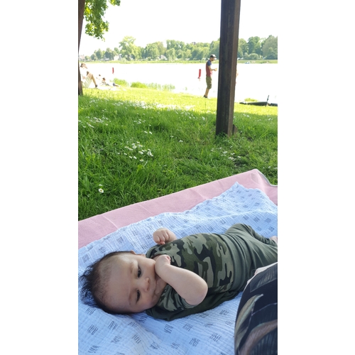 Romper met korte mouwen en een broek. Geen sokken! Hij had nog een shirt aan, maar vond het zo warm voor hem! Goed in z’n nekje blijven voelen