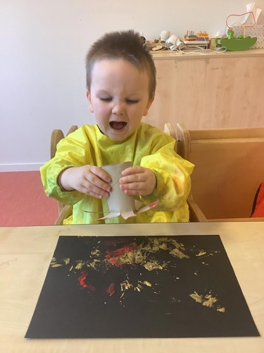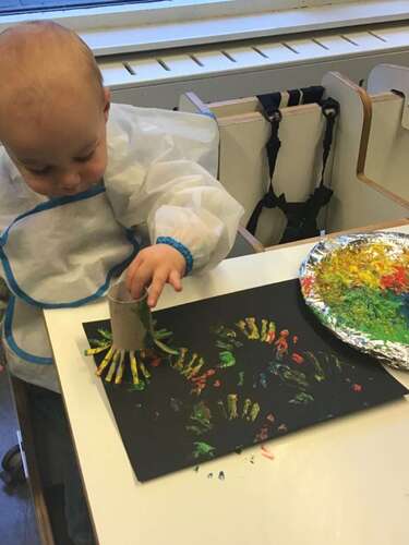 Wat hier ook een grote hit is: spelen met gekleurd papier. Niet echt ‘knutselen’ maar wel makkelijk om even op te zetten. Samen door de kamer meerde vellen gekleurd papier leggen en dan ‘spring naar geel’, ‘ren naar rood’ etc. Evt. moeilijker te maken door kleuren en cijfers te combineren (‘spring naar groen 3’).