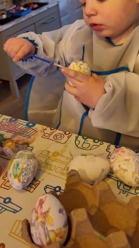 Tip; Action heeft een leuk setje om nep paaseieren te verven. Incl verf/stickertjes/oogjes.