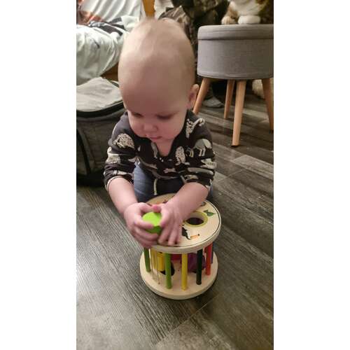 Hier meisje van net 10 maanden, ze heeft een activiteiten kubus met meerdere elementen.