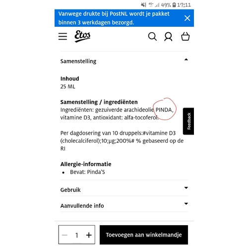 Ik kwam hier pas achter door dat iemand mij hierop wees. Ik gebruik sindsdien voor mijn zoontje de vitamine D van de Kruidvat. Ik heb zelf een milde pinda allergie dus schrok ervan dat dit in een vitamine zit voor baby's stel dat jou kindje allergisch is.