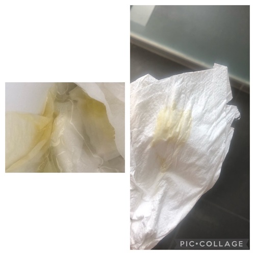 Ik denk dat het urine of afscheiding is. Bij is het toiletpapier ook wel eens licht gelig. Niet lekker om te lezen maar bij druppelt het afscheiding er ook letterlijk uit 🤣 vier keer per dag verschonen is niets geks hier