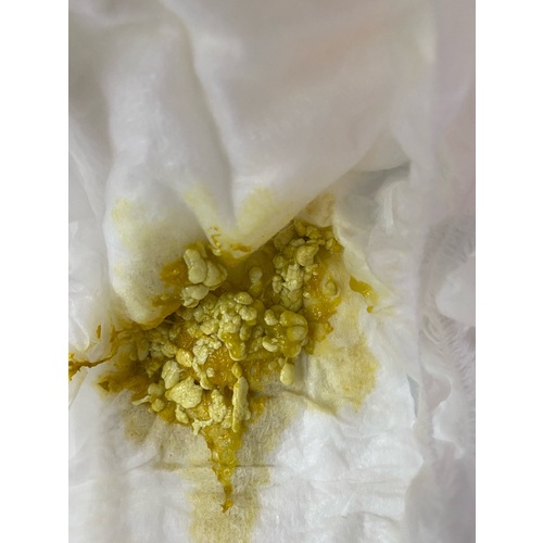 Vandaag had ze wel eerste een flinke stink luier (voor het eerst dat ik dacht ieh vies luchtje). Daarna deze vlokkerige ontlasting.