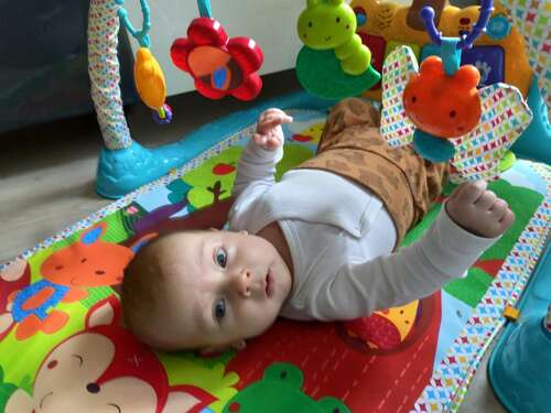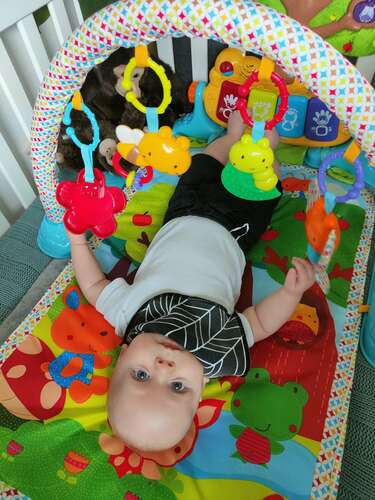 Deze heb ik ook! Mijn zoon vind hem fantastisch. Een diertje heeft een knisperstaart nou daar wordt heel hard aan getrokken. Wat ook fijn is, is dat je de buizen en speeltjes kunt verschuiven.
