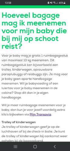 Wij vliegen morgen met Transavia, en er staat dat je per volwassenen 2 stuks handbagage mee mag nemen met een totaal van 10 kg, een baby mag geen handbagage mee. Online vond ik ergens dat de buggy in het ruim gaat, daarom doen wij een buggy en niet de kinderwagen.