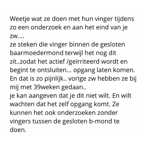 Na inwendig onderzoek, om te kijken of er ontsluiting was, heeft ze gelijk gestript, had ik ook bloed verlies. Ik werd wel daarna gelijk opgenomen en verder ingeleid door mijn vliezen te breken en weeën opwekkers gekregen, niet vanwege bloedverlies, geplande inleiding. Toen verloor ik daarna ook stolsels, maar goed mijn bevalling was gestart, nu een dochter in me armen, van 1 week en 5 dagen oud 💗