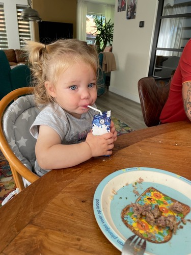 Wel grappig dat ze zichzelf soms corrigeert. Dan zie je het handje het eten omhoog gaan om te gooien en zegt ze niet doen 😂