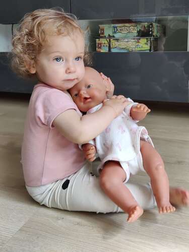 Ze heeft sinds een week of 2 opeens heel veel interesse in boekjes, terwijl ze die daarvoor nooit echt heel interessant vond. Nu komt ze steeds aanlopen met boekjes, gaat dan heel onhandig op mijn schoot zitten en wil dan voorgelezen worden. Daarnaast kan ze heel lief spelen met haar pop. Ze geeft kusjes en knuffels en wil de pop de fles geven en de luier verschonen.