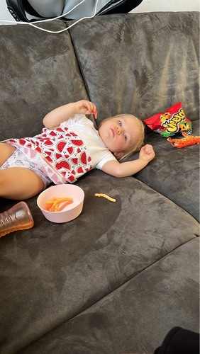 Ze rent! En vind het heerlijk om heel de dag mama na te doen. Praten doen we hele dag maar ze blijft nog bij paar simpele woordjes. Mama papa happen kaas. Maar verder als ik iets vraag of zeg weet ze het echt aan te wijzen. Ze slaapt nog maar 1x per dag en alle nachten is ze wakker. Dit is nooit anders geweest, oorzaak kunnen we nog niet vinden. Eten lust ze alles het lekkerst is wat op mama's bord ligt al is dit hezelfde op haar bord 😅.