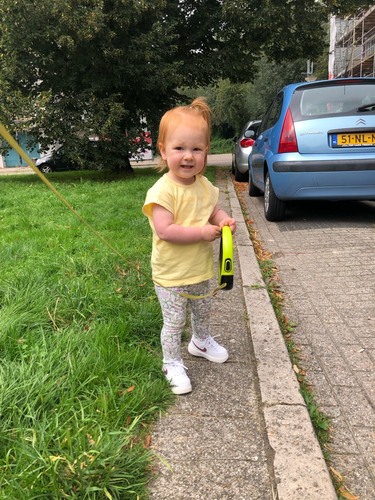 Maisy wordt 2 september anderhalf. Ze is sinds een paar weken heel hard aan het oefenen met lopen en doet dit de laatste 2 a 3 weken steeds vaker stukjes los. Verder nog veel aan de hand lopen. Ze kletst heel veel, maar heeft een stuk of 10 verstaanbare woordjes. Ze snapt nu wel heel veel van wat wij zeggen en antwoord vaak met ja of nee als we vragen of ze iets wilt. Ze kan ook al verschillende lichaamsdelen aanwijzen.