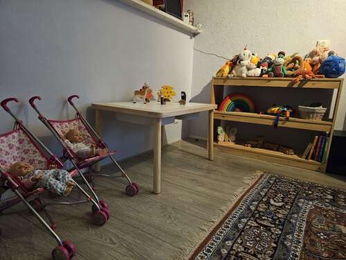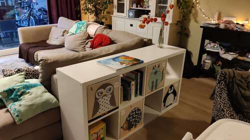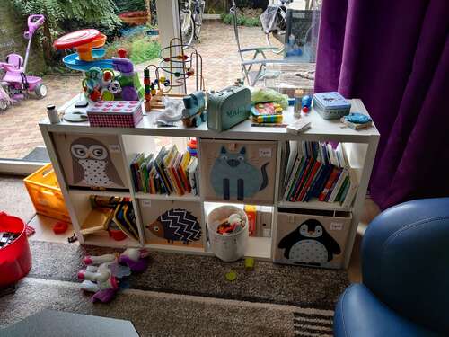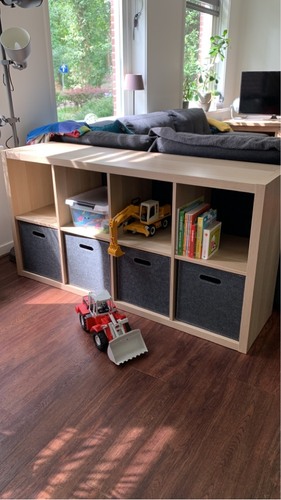 Hier ook een kallax. Inmiddels ook iets voller. Onderin bakken en bovenin los te vullen. Bovenop evt ook wat. Staat mooi achter de bank uit het zicht. Hebben er ook een tafeltje met 2 stoeltjes bij. Dat is zn speelhoek. (Maar laat hem 10 minuten spelen en de hele benedenverdieping is ontploft..)