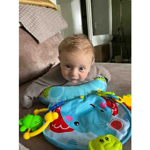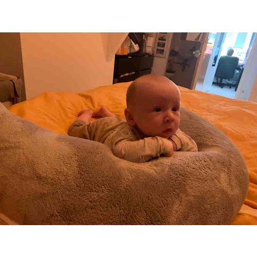 Ook oefen ik tummy time op een kussentje. Dan vindt hij het nog wel oké maar plat op z’n buik niet zo.