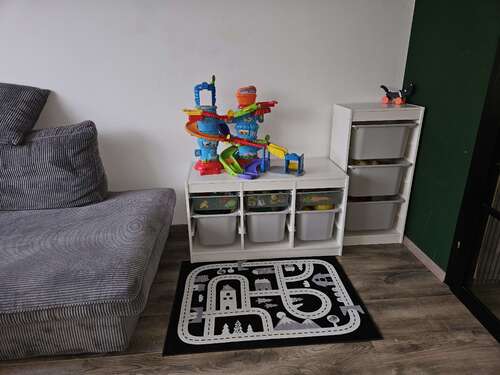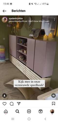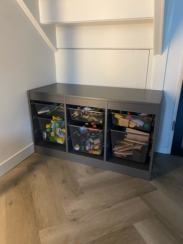 Kasten zijn van Ikea en de bakken ook :) ja merk dat de kindjes ook fijn vinden. Ze trekken 1 bak open en daar zit 1 soort speelgoed in. Dus alles is ook georganiseerd zodat ze goed hun speelgoed kunnen kiezen. 1 bak blokjes. 1 bak alle dinos 1 bak alle toettoet auto's 1 bak knuffels nou enzovoort x