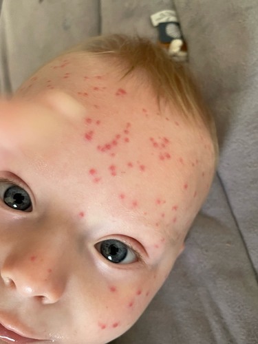 Update, we hebben uiteindelijk een dermatoloog hiernaar laten kijken en die zegt toch muggenbulten… bij babies kunnen die “scatteren” en dus als heel veel kleine bultjes zichtbaar worden..