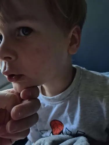 Goedemorgen. Mijn zoontje kwam vanmorgen met deze vlekjes op zijn gezicht uut bed. Iemand een idee wat het kan zijn? Hij heeft de afgelopen avonden wel wat koorts gehad maar overdag niet. Hij voelt zich verder goed zegt hij.