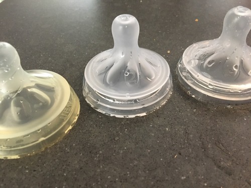 Ohh ik werd hier helemaal gek van! Maar inderdaad hadden we kennelijk spenen uit de nieuwe collectie, daar krijgt ze helemaal niets uit. De ‘goede’ spenen kan je herkennen aan de spiraal op het tutje (bij jou helemaal links), de andere hebben dat niet. Echt zo dom van een groot bedrijf als Philips dat ze dit niet duidelijker op de verpakking zetten ofzo. Hoe een baby überhaupt iets uit die nieuwe collectie kan drinken snap ik niet. Wij hebben nu de nieuwe weggegooid en de nummer 2 van de oude collectie en nu gaat het gewoon weer goed en snel.