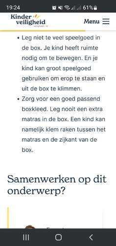 Hier ook een matras met hoes en daarop een boxkleed. Vond het ook maar dun anders, dus voelde dit beter. Het is volgens mij enkel 'gevaarlijk' wanneer ze druk gaan rollen en bewegen. Dat je dan moet uitkijken dat ze niet onder het boxkleed rollen, maar goed dat is zonder matras ook geen goed idee lijkt me.
