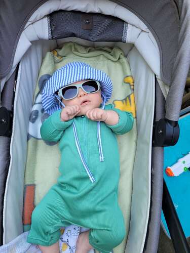 Ik smeer mijn baby (10 weken) niet in. Alleen in de schaduw met een hoedje ...