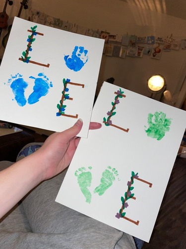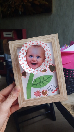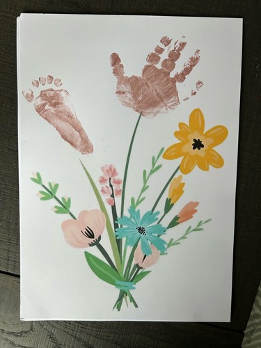 Ik heb dit gemaakt, het boeket zo van internet geplukt en uitgeprint. Met vingerverf de voet van m’n dochter (7wk, hand ging niet want altijd gebalde vuisten 😛) en de hand van mijn zoon. Deze afdruk gaat in een mooi lijstje.