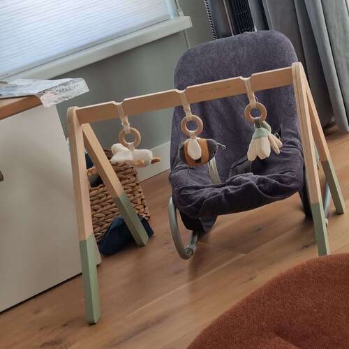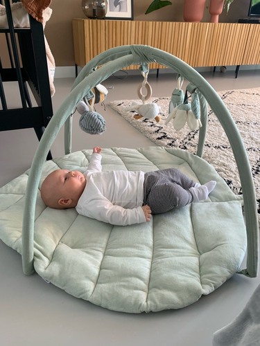 Wij hebben een babygym van Jollein en zo kunnen alle speeltjes precies op de juiste hoogte gehangen worden, zodat ze er bijkan (raakt verveeld als dit niet kan namelijk).