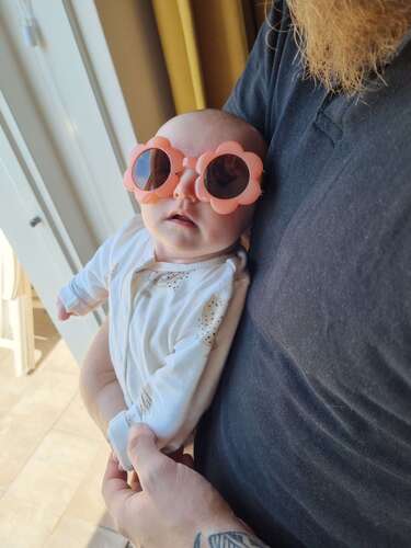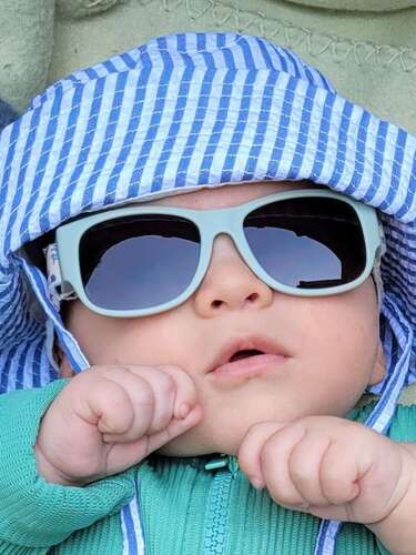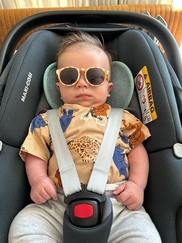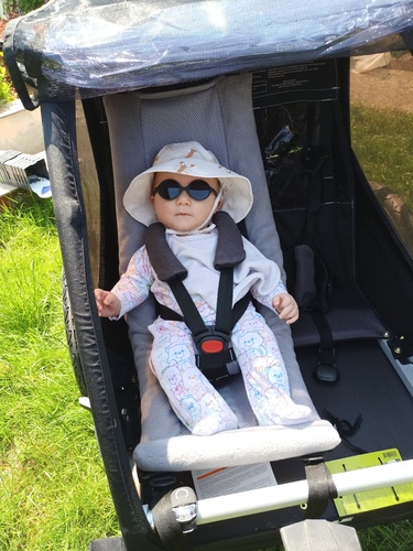 Ik heb een zonnebril omdat ik merk dat hij zijn oogjes dichtknijpt ondanks het hoedje. Maar doordat die nog niet zelfstandig zit en dus zijn hoofd laat rusten schuift dat ding altijd weg 😅