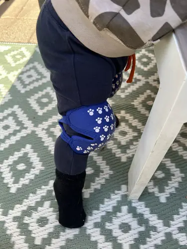 Heb ze vandaag geprobeerd. Ze zitten beetje zoals een kniebeschermer van het skieleren zeg maar. Maar hij heeft lekker buiten kunnen kruipen en vond het allemaal wel prima. Zijn makkelijk aan en uit te doen. Hij stond zelfs toen het bedtijd was bij de deur te zeuren om naar buiten te gaan🤣 was echt niet blij dat hij niet buiten mocht spelen.