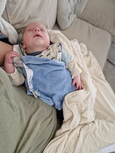 Ja hier ook overdag noooit in bed. Wandelwagen in de woonkamer, zijn box (waar ik uiteraard gewoon bij ben) of gewoon zoals nu op fit moment heerlijk in coma in mn armen op de bank🥰