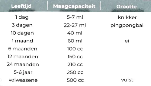 Dat is logisch, want als je die hoeveelheid eenmaal gegeven hebt en de maag is hiermee (onnatuurlijk, dat helaas wel) opgerekt, dan heeft je kleine daarna natuurlijk niet meer genoeg aan een kleinere hoeveelheid. Het schema dat je deelt van het ziekenhuis is gewoon overgenomen van wat de producenten van kunstvoeding op hun verpakking aangeven, dat heeft niets met de natuurlijke maaginhoud te maken, die is veel kleiner. Met kunstvoeding is echter de instelling ‘zo veel mogelijk geven zodat er zoveel mogelijk tijd tussen zit’, want dat is natuurlijk het meest praktisch voor de ouders. Maar ergens is het ook best gek, want zelf laat je ook niet vaak 4 uur tussen de momenten dat je iets eet of drinkt. Tenminste, ik doe niet graag 4 uur zonder kopje thee 😉
