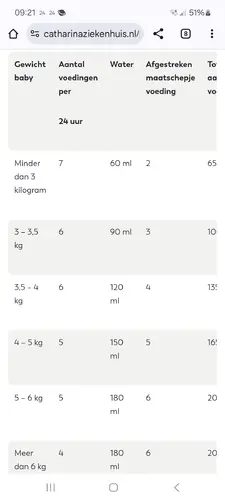 Dank hiervoor, maar snap er nix van. Want onze dochter doet t echt goed op die hoeveelheid (Uiteraard rustig opgebouwd), geeft ook weinig terug en als ze eerder genoeg heeft, stopt ze met drinken. Als we deze grafiek zouden aanhouden, zouden we 15 x de fles moeten geven ipv 5x 🤯 en daarnaast.. we verdelen t over 2 flesjes en als de 90cc op is huilt ze gelijk van de honger... je laat je baby ook niet huilen. Na een 2e flesje is ze helemaal tevreden.