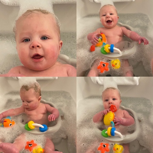 Ze kan zelfstandig zitten maar in die badring glijd haar kontje wel altijd naar voren😅