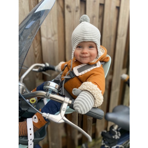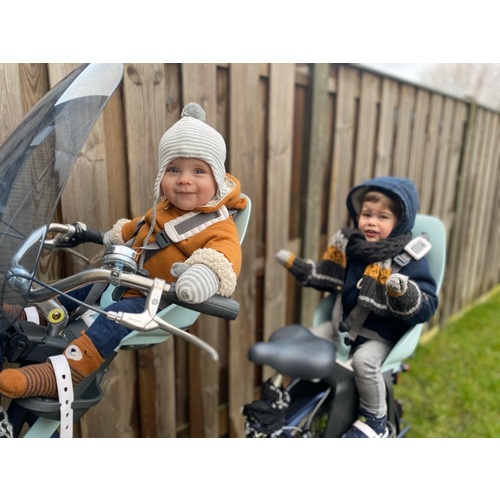 Tegen de kou heb je van deryan een voetenzak met regenjassen er in. Ik heb het stoeltje van yepp. Daar kun je ook een extra adapter bij halen. Stoeltje lijkt mij comfortabel want materiaal is stevig maar toch ook zacht (geen idee hoe ik dit moet omschrijven 😅) en door de gaten blijft er geen regen in staan