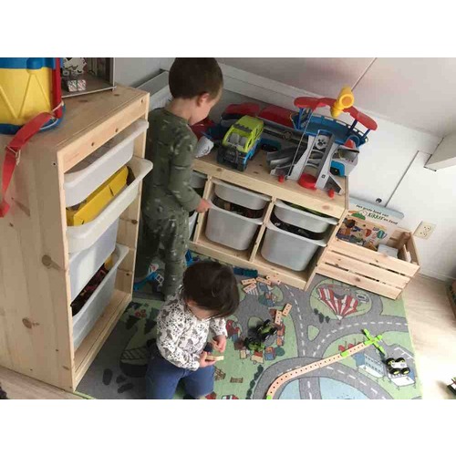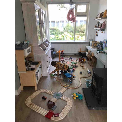 We hebben sinds kort boven ook nog een speelhoekje op de werkkamer zodat de oudste zich daar kan terugtrekken. We wisselen een beetje met het speelgoed wat we aanbieden (boven/beneden/berging) om het interessant te houden.
