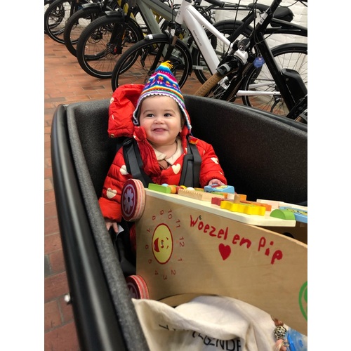 P.s. de kleuterzitjes zitten vast op het bankje, dus zelf geen apart peuterstoeltje of fietsstoeltje gekocht. In mijn ogen ook echt niet nodig.