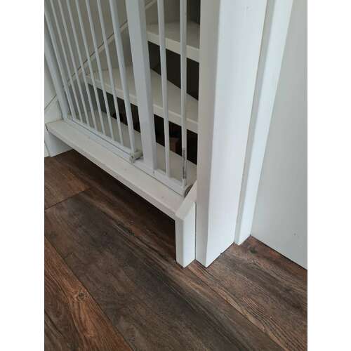 Wij hebben dit beneden! Hebben het opgelost door een balk aan de open kant neer te zetten (aan de trap geschroefd) en dan een normaal hekje er tegenaan. Ziet er nu zo uit als op de foto. Ik zou wel de balk breder maken zodat het hekje aan de voorkant van de tree kan (ivm midden zoals wij hebben) of op de grond. Bij ons klimt hij er nu namelijk op 🙈