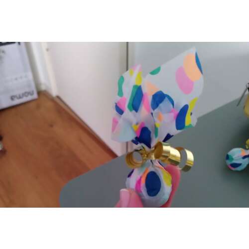 Deel 1 van de traktatie, een stuiterbal in vloeipapier met een lintje, komt samen met een doosje rozijntjes in een mooi papieren tasje.