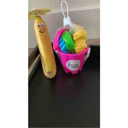 Ik maak traktaties voor mijn bedrijfje. Ik zou een knijpfruit, doosje Rozijntjes, z’n toeter en dan stoepkrijt. Super leuk!