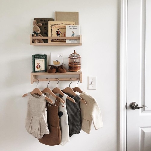 Wel hebben we van die ikea kruidenrekjes (zie voorbeeldfoto) waar we eventueel een paar kleertjes aan kunnen ophangen, die echt gehangen moeten worden. Mochten we echt hangruimte missen, schaffen we alsnog een hangkast aan of besluiten we dingen in onze eigen kledingkast te hangen..