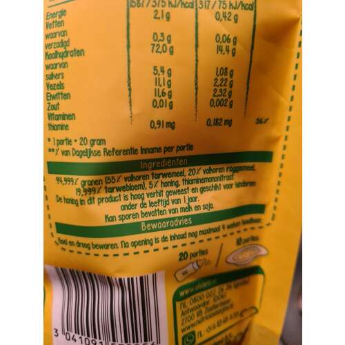 Ik denk inderdaad ook dat door de verwerking de honing veilig is. Verse honing kan infantiel botulisme veroorzaken, maar volgens mij kan dit in zo麓n granenmengeling niet meer zitten.