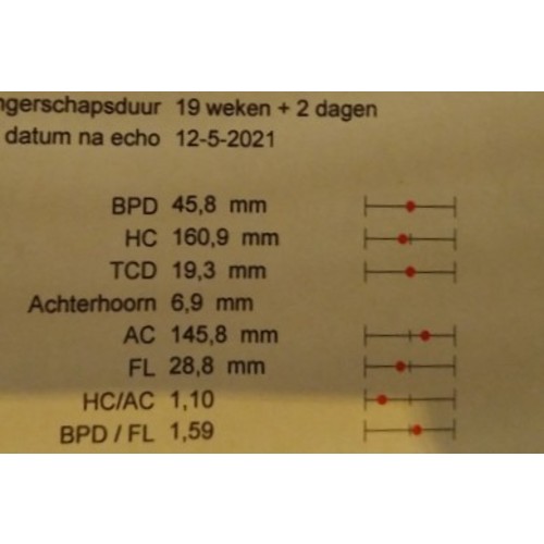 Ik heb ook geen lijstje meegekregen, wel werd ons verteld dat alles goed was. Uitgerekend op 13 mei en alle metingen lieten een datum tussen 11 en 15 mei zien, dus het ging goed met onze kleine meid zei hij. Gewicht heb ik wel onthouden, 275 gram bij 19+1