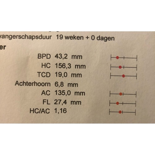 Hier geen lijstje mee gekregen. Ook geen idee of er iets boven of onder het gemiddelde zat. Het was gewoon allemaal goed volgens de echoscopiste.