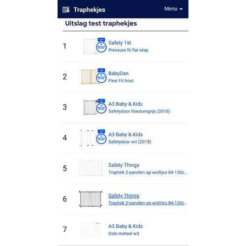 Geen consumentenbond maar wij hebben de lascal kiddyguard al 2 jaar in gebruik na tevredenheid. Rolt op dus geen gedoe met hekjes die in de weg zitten etc. Je hebt wel echt 2 handen nodig om m dicht te doen maar dat is dan t enige nadeel van een oprolbare!