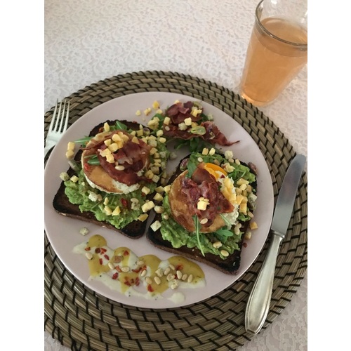 Geroosterde bruine boterham (vol vezels voor de baby natuurlijk馃槈鈽猴笍) Avocado 馃 met een pancake-ei 馃嵆met gebakken spek 馃 Italiaanse notenmix, gebrokkelde oude kaas 馃 en rucola salade. Pure verwennerij馃グ