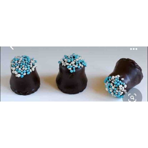Lange vingers of stroopwafeltjes met chokola en blauwe muisjes