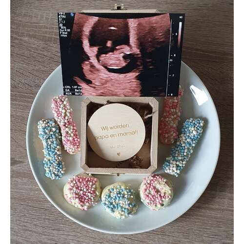 Dit heb ik bij de aankondiging gemaakt 😄 Oreo koekjes en lange vingers in chocolade met muisjes (of glutenvrij met stads-/landgenootjes ;-) Google maar!)