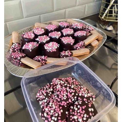 De bovenkant van negerzoenen afsnijden en in muisjes dippen, chocola smelten hier flikken van maken met muisjes, lange vingers dippen in chocola en door de muisjes (kan ook met boter)