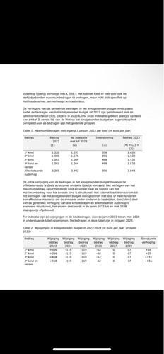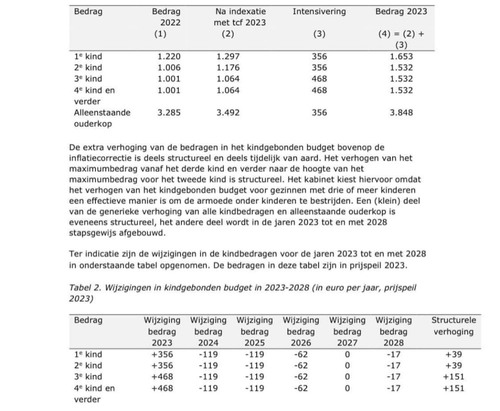 De bedragen voor kindgebondenbudget worden hoger. In 2023 in verband met de inflatie een heel stuk hoger en daarna elk jaar weer een beetje minder, maar al met al blijft het meer dan in 2022.