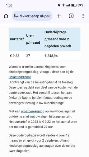 Ik heb geen recht op toeslag, omdat ik ook thuis ben, mijn zoontje gaat vanaf mei 2 ochendjes naar de peuterspeelzaal, daar betaal ik dan rond de 250€ voor